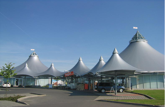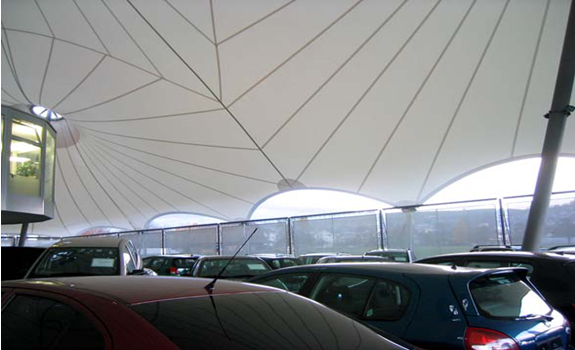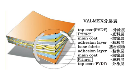 2. Composition of membranes. PVC membranes used in membrane structures are composites formed by coating or laminating PVC (polyvinyl chloride) on polyester fibre fabrics (PES). The material and knitting technology of the base cloth mainly determine the tensile strength and tear strength of the film. At the same time, the surface treatment of the outer coating further provides the physical properties of the film, such as fouling resistance, fire resistance, heat resistance, durability and anti-ultraviolet radiation, as well as increasing the service life of the film.