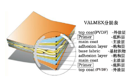 膜結構所用的PVC膜材是在聚酯纖維織物(PES)上涂敷或層壓PVC(聚氯乙烯)而形成的復合材料;嫉牟牧霞熬幙椆に囍饕獩Q定膜材的抗拉強度,抗撕裂強度等力學(xué)性能。而涂敷層的PVC(聚氯乙烯)在一定程度上提高了膜材的各項性能指標;與此同時(shí),外涂層的表面處理則進(jìn)一步提供了膜材的耐污、耐火、耐熱、耐用和抗紫外線(xiàn)輻射等物理性能,以及增加膜材的使用年限。