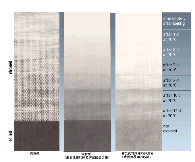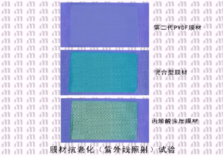 由于加入了一定比例的丙烯酸酯(Acrylic),從而嚴重影響了PVDF涂層在自潔性、耐污性和耐久性等各方面的性能。所以,盡管“混合型PVDF膜材”在抗剝離性能方面有了很大的提高,但是在其自潔性、紫外線(xiàn)輻射下的抗老化性、耐污性及耐久性方面的性能是相對下降了很多。