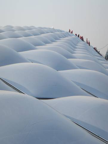 不僅如此,這種膜還具有良好的聲學(xué)性能,可有效消除回聲避免了玻璃層頂產(chǎn)生的噪音;具有的自清潔功能,使灰塵不易附在其表面。這種材料另外的一大優(yōu)點(diǎn)就是可在現場(chǎng)預制成薄膜氣泡,方便施工和維修;近年來(lái),由ETFE 制成的膜材料替代傳統的玻璃和其它高分子采光板用于大型建筑物的屋面或墻體,顯示出無(wú)可比擬的優(yōu)勢。