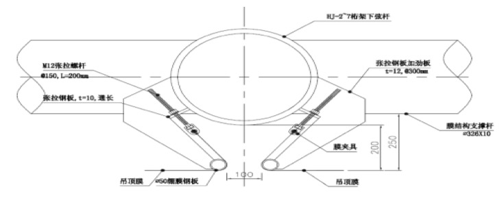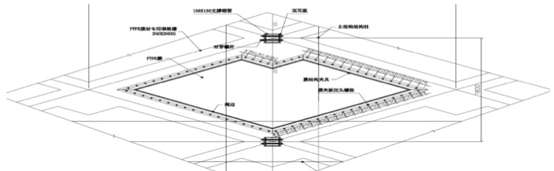 雖然預張力對骨架式膜結構的形態(tài)的影響不及張拉膜,但也必須引入足夠大的張力,保證結構受力特性,避免在風(fēng)荷載作用下膜面發(fā)生較大震動(dòng),導致松弛膜面凹陷。骨架一般暴露于膜內側,而且膜的透光性更加突顯骨架的室內視覺(jué)效果,因此,骨架的布置、形式、材料、節點(diǎn)等是設計考慮的重點(diǎn),要力求簡(jiǎn)潔、美觀(guān)。