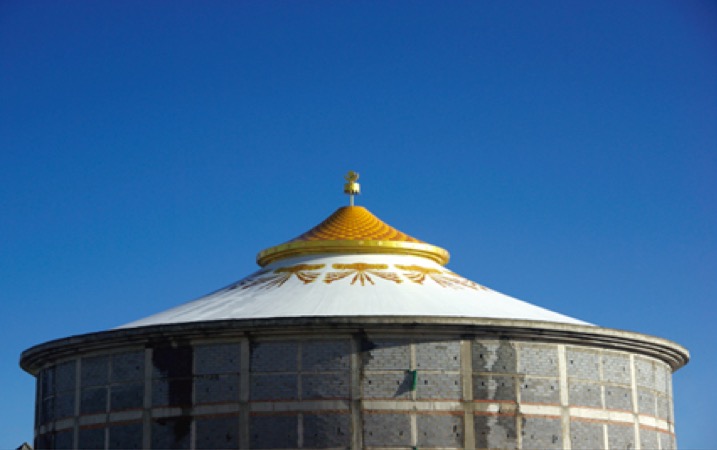 建筑外形是城市公共空間與建筑空間相鄰的界面,成為城市空間的組成部分。它是人們視覺(jué)最先接觸的部分,因此,除了功能以外,還應有很強的標識性,并能體現建筑的個(gè)性,是建筑環(huán)境和城市景觀(guān)的重要組成部分。由于膜結構自然的曲線(xiàn)美是其他結構類(lèi)型無(wú)法比擬的,故成為近來(lái)建筑入口及屋頂經(jīng)常采用的形式。剛察演藝中心外層膜面為PVDF涂層膜材上面采用高頻焊接上,體現藏飾風(fēng)格明顯的金黃色膜材,有很強的名族特色表現力。