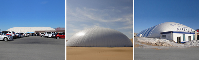 將一塊碩大的拼接起來(lái)的整體膜布通過(guò)氣壓撐起一個(gè)大跨度封閉結構,空間下邊緣嚴密的固定于地面或平整的墻體上,并由金屬構件與混凝土地梁錨固,不間斷的向里面充氣,其原理與吹氣球一樣把整個(gè)膜體膨脹起來(lái),由于膜材的內外壓力差形成固定的空氣支撐體。配有先進(jìn)的自動(dòng)控制系統,自動(dòng)平衡充氣設備及停電時(shí)能自動(dòng)啟動(dòng)的發(fā)電機,即可保持氣膜長(cháng)時(shí)間正常使用,長(cháng)期可處于無(wú)人自動(dòng)控制狀態(tài)。